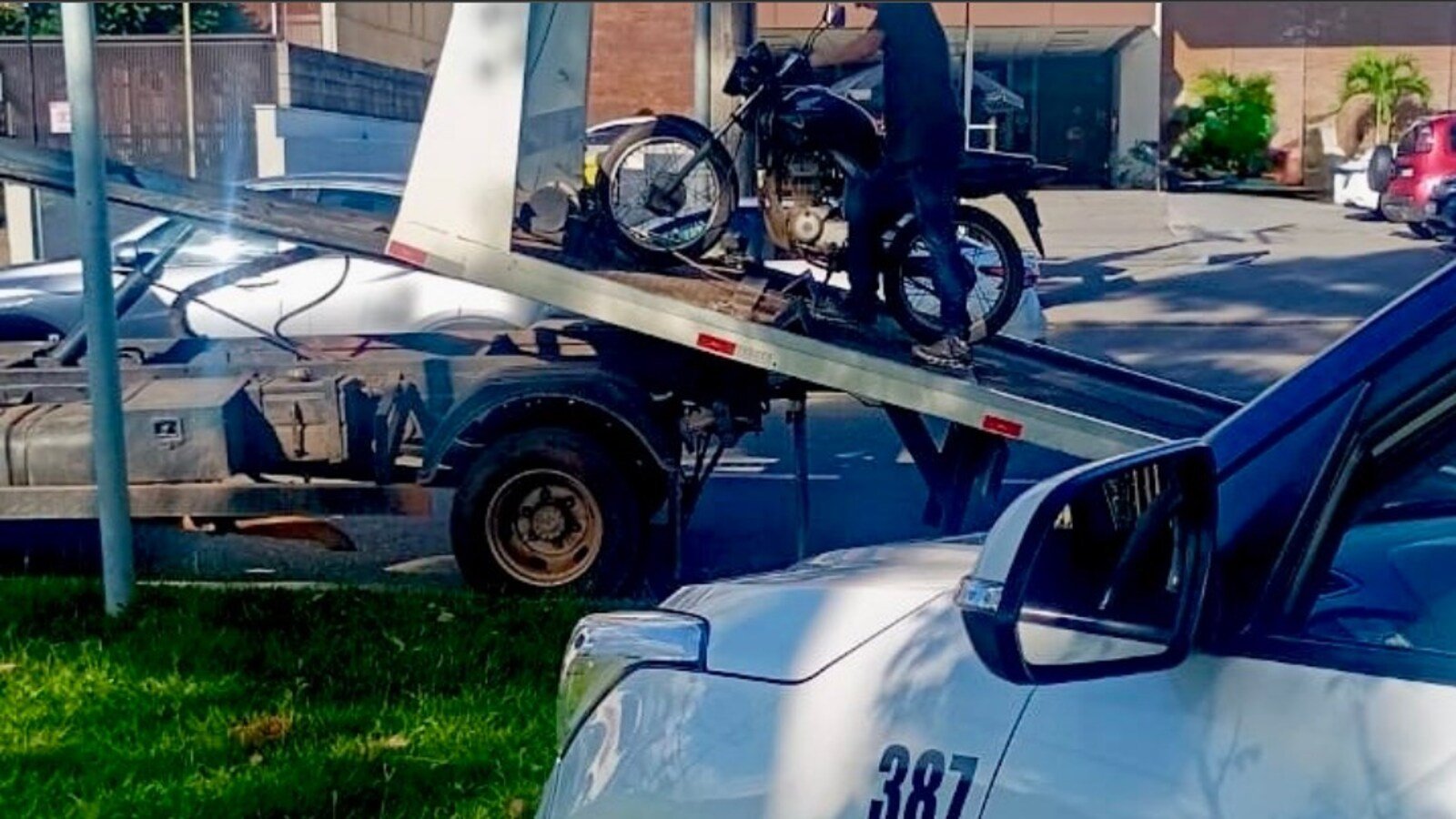 Diante da impossibilidade de regularização no local, a motocicleta foi autuada e recolhida ao pátio, conforme prevê a legislação de trânsito vigente.