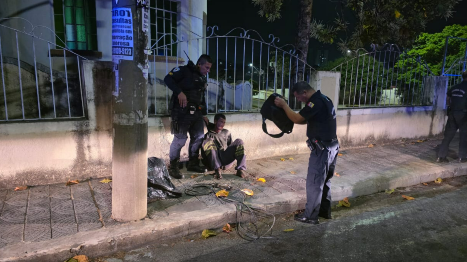 Com o homem, os agentes apreenderam uma mochila com alicate e faca, usados para cortar os cabos, além de um saco preto contendo latas de alumínio e aproximadamente 15 metros de fios elétricos furtados da policlínica.