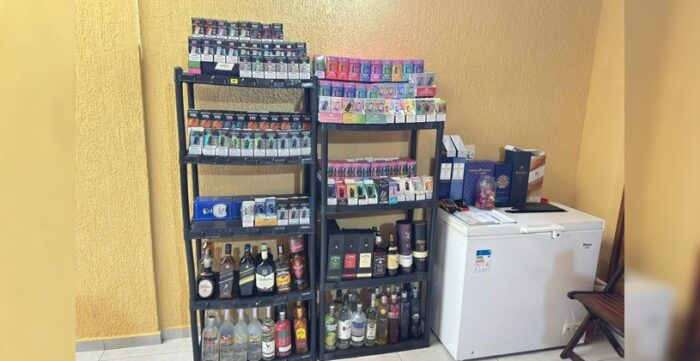 Durante as diligências em um estabelecimento comercial da cidade, os agentes localizaram diversas garrafas de bebidas alcoólicas, entre elas uísque, vodca, gin e rum. No local também foram encontrados cigarros eletrônicos, como pods e vapes.