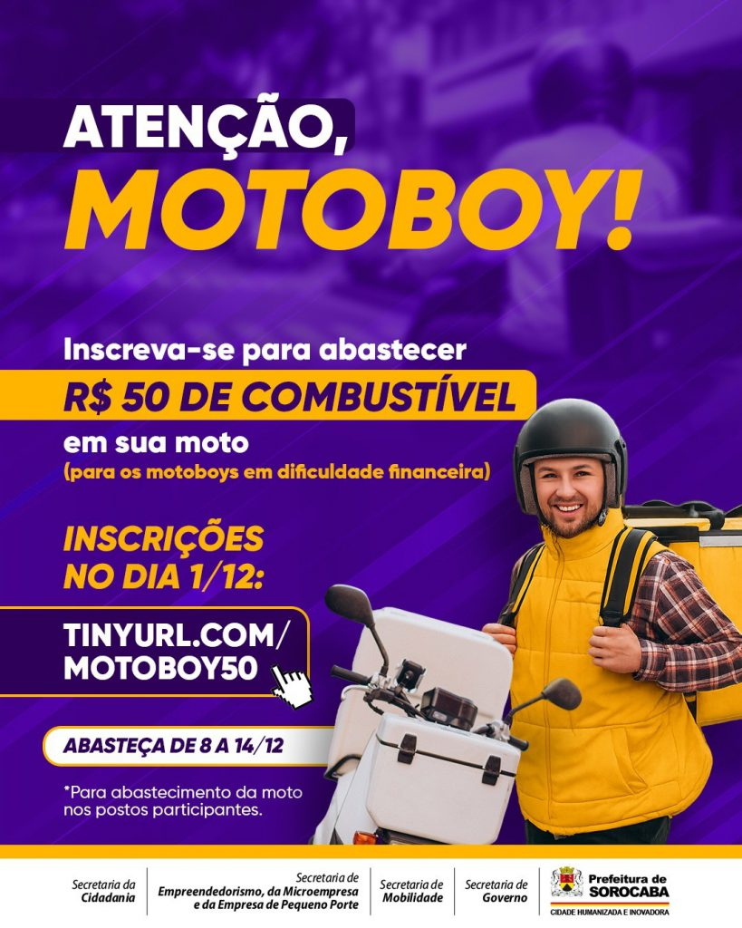 A Prefeitura de Sorocaba anunciou a abertura das inscrições para o programa que oferece crédito de R$ 50 em combustível destinado a motoboys cadastrados no CadÚnico. A iniciativa é promovida pelas secretarias de Governo (Segov), de Mobilidade (Semob), da Cidadania (Secid) e do Empreendedorismo, da Microempresa e da Empresa de Pequeno Porte (Semepp).