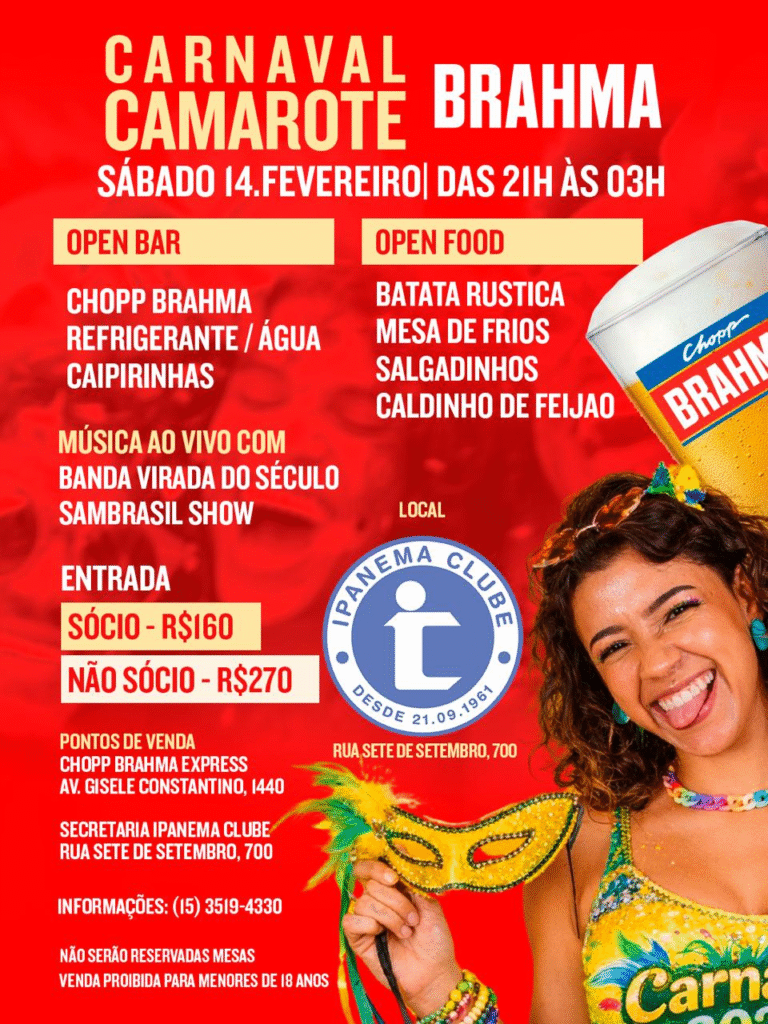 O Ipanema Clube, em Sorocaba, recebe neste sábado, 14, mais uma edição do tradicional carnaval, desta vez com o “Camarote Brahma”, prometendo uma noite de muita música, gastronomia e diversão para o público. A festa será realizada das 21h às 3h e contará com o setor exclusivo com sistema open bar e open food.