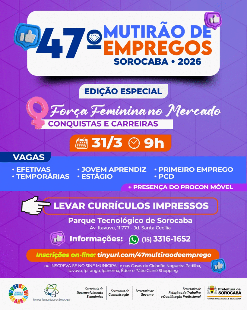 A Prefeitura de Sorocaba promove, no dia 31 de março, a partir das 9h, a 47ª edição do Mutirão de Empregos Sorocaba, com o tema especial “Força Feminina no Mercado: Conquistas e Carreiras”. A ação será realizada no Parque Tecnológico de Sorocaba, em Sorocaba.